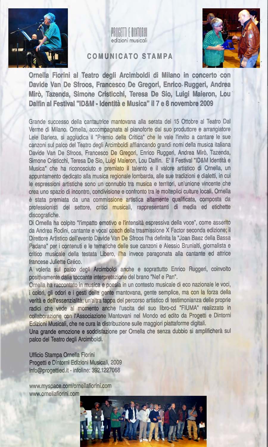Ornella Fiorini al Tratro Arcimboldi di Milano. In concerto con Davide Van De Sfroos, Francesco De Gregori, Enrico Ruggeri, Andrea Mirò, Tazenda, Simone Cristicchi, Teresa De Sio, Luigi Maieron e i Lou Dalfin al Festival “ID&M – Identità e Musica”, il 7 e l’8 novembre 2009.
